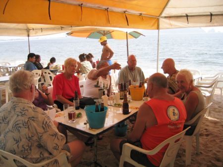 The 2004 Tomzap Party was held at Bigotes Restaurant and Video Bar in Melaque, Jalisco, on February 13th at 2:00 pm. It was an overwhelming success with over 60 in attendance. Furthermore, the management and staff of Bigotes made it happen! They arranged with SOL (Cerveza, Co.) to erect 3 large tents on the beach, and supplied tables and chairs for the party as you will see in the photos. Feel free to provide info for the photo captions tom@tomzap.com