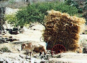 This picture was taken from the ruins at Lambetyeco, near Oaxaca city. It's meant to convey the mix of modern and ancient that one runs into all the time in southern Mexico. Notice the bicycle wheel uphill from the hay load. A more modern commuter is just about to pass.[Photo by Diana Ricci] |